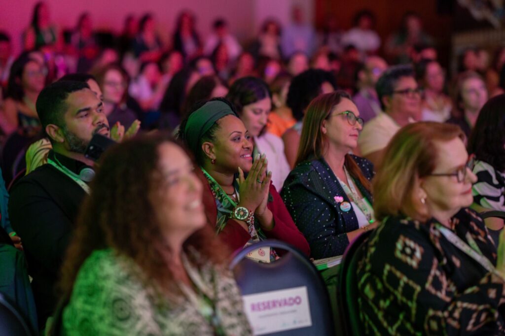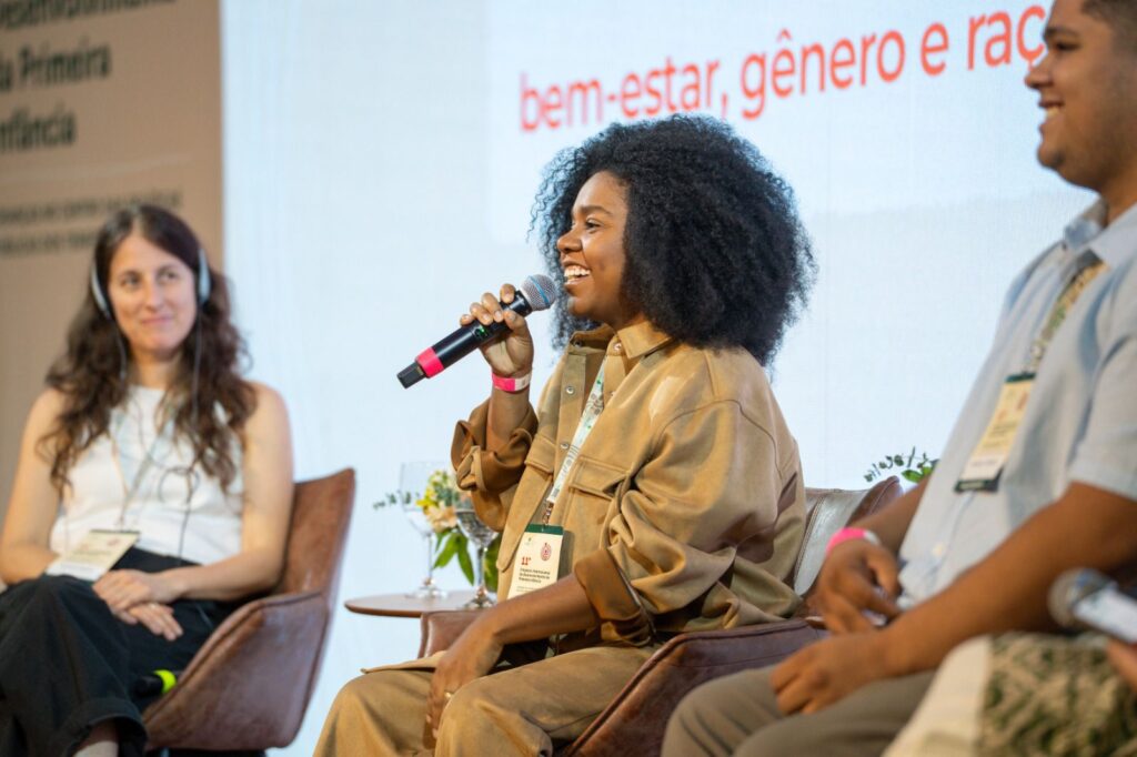 Em outra mesa, Patricia Núñez (Fundação Van Leer), Thais Ferreira (vereadora do Rio de Janeiro) e Emanuel Herbert (rede de mulheres indígenas Makira E’ta) debateram sobre o bem-estar de quem cuida e a abordagem de gênero e raça no contexto da primeira infância.