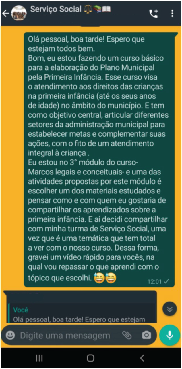 Luanne Martins, de Teresina- PI, elaborou um texto refletindo sobre a atenção integral, enviou pelo whatsapp para a sua turma de graduação em serviço social e ainda gravou um vídeo.