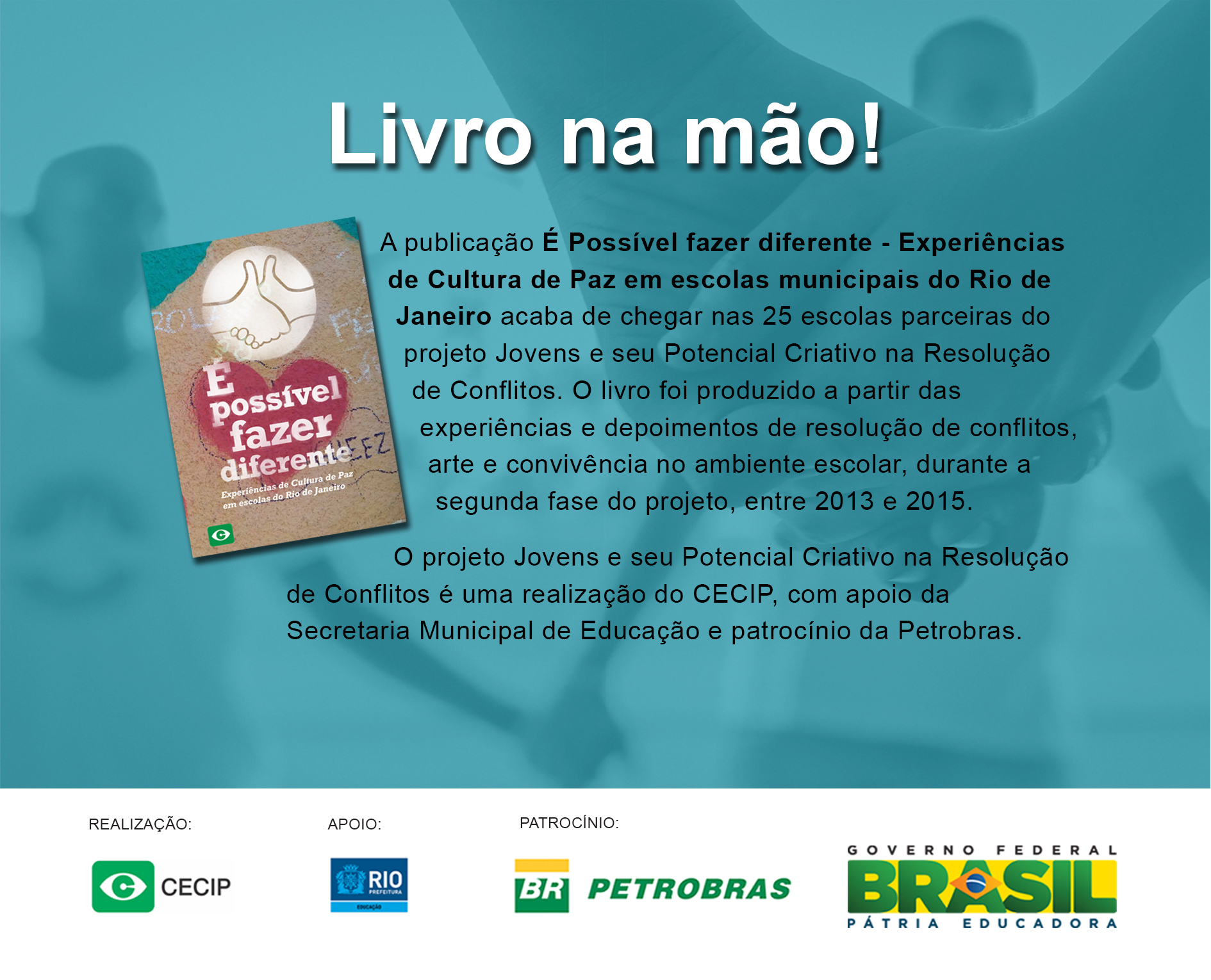 Chegou o novo livro do Núcleo de Educação para a Paz “É possível fazer diferente”, registro da experiência do projeto Jovens e seu Potencial Criativo na Resolução de Conflitos nas escolas municipais do Rio de Janeiro.