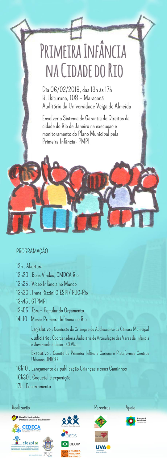 Primeira Infância na Cidade do Rio é uma realização do Grupo de Trabalho de Implementação e Monitoração do Plano Municipal pela Primeira Infância, PMPI, do Conselho Municipal da Criança e do Adolescente- CMDCA, por meio das instituições da Sociedade Civil que compõem o GT, Centro Internacional de Estudos e Pesquisas sobre a Infância-CIESPI/ PUC- Rio, Centro Integrado de Estudos e Programas de Desenvolvimento Sustentável, Centro de Defesa das Crianças e Adolescentes – CEDECA Rio de Janeiro, Centro de Criação da Imagem Popular-CECIP e Fundação Xuxa Meneghel, com apoio da Universidade Veiga de Almeida e Fundação Bernard Van Leer.